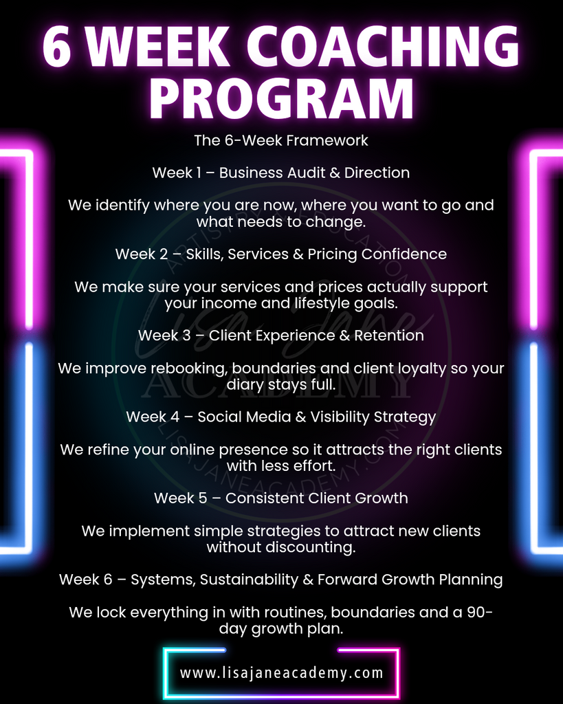 £399 for the 6 week plan including 6 x 60 minute one to one calls, messaging between sessions for clarity, social media audits, access to masterclasses and ongoing support from someone who has walked in your shoes and built several successful businesses in the industry.