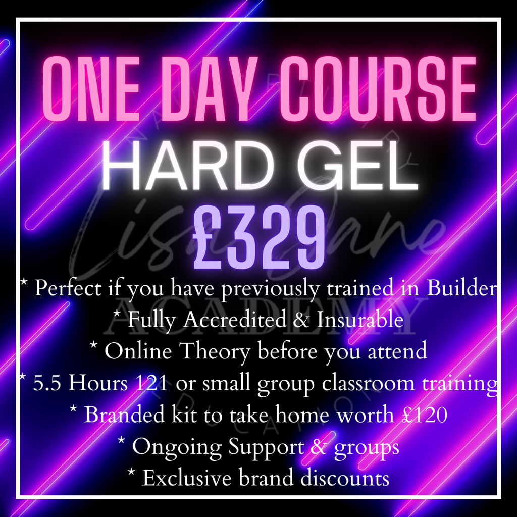 On this course, you will learn Hard Gel over 5.5 hours of in person training. Please choose whether you want to learn 121 or are happy to train in a small group of up to 6.